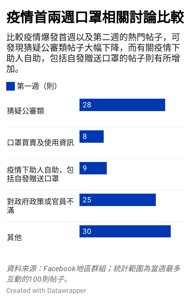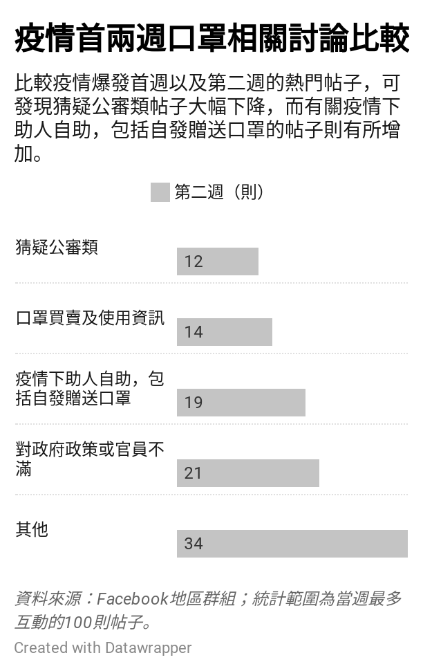 整理疫情首兩週,最多互動的100則口罩討論,並分為四類:猜疑公審類、資訊類、好人好事類,以及抒發不滿類,可發現爆疫首週,猜疑公審類帖子比例不低,但在第二週則見明顯減少。同時,有關疫情下好人好事的討論在第二週倍增,由9則增至19則。